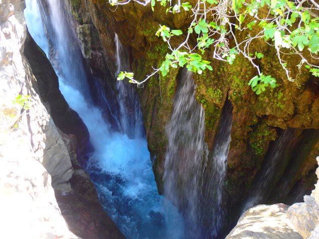 After the coffee in the old house, we continue the hike with a precipitous descent. We will see some abandoned homes along the river. Here we may need the grape vines to help us going steady our way down, but we can also use the ropes we always bring. You will notice the river flowing faster and louder here, ready to turn into the waterfall. We see beautiful rock formations with greenery and trees around us. The river needs to be crossed more often now, until we come to a natural slide. This will slide us about 5 meters down to a rocky trail leading to the waterfall.