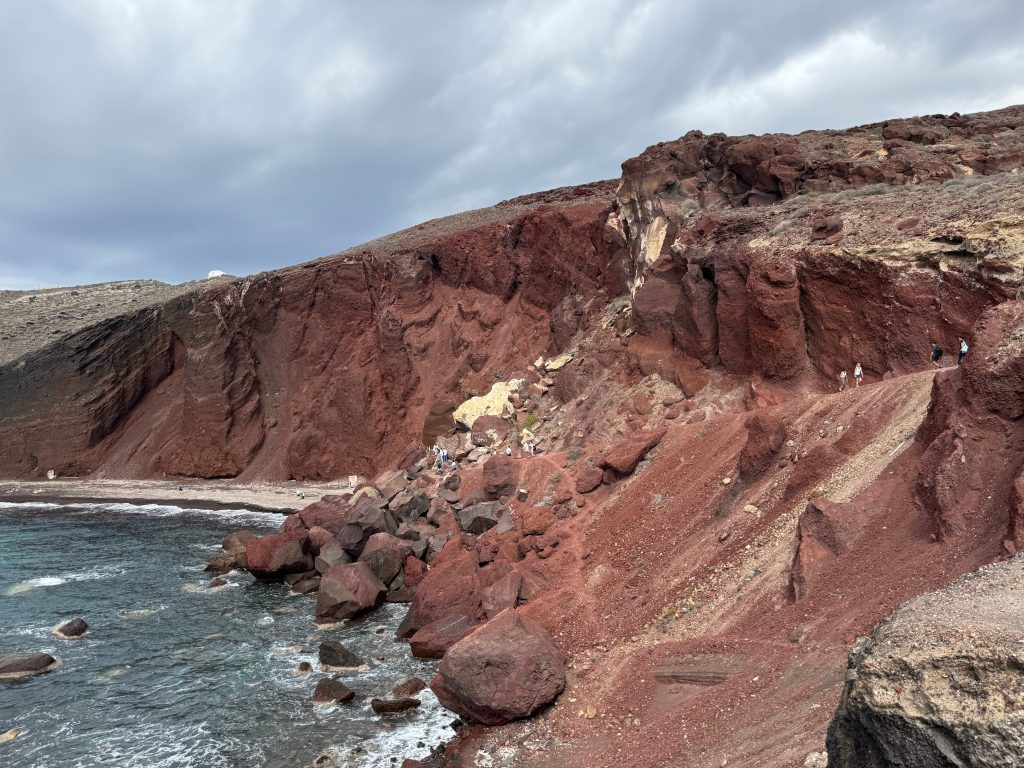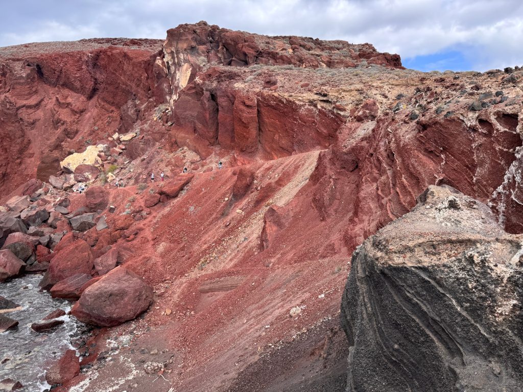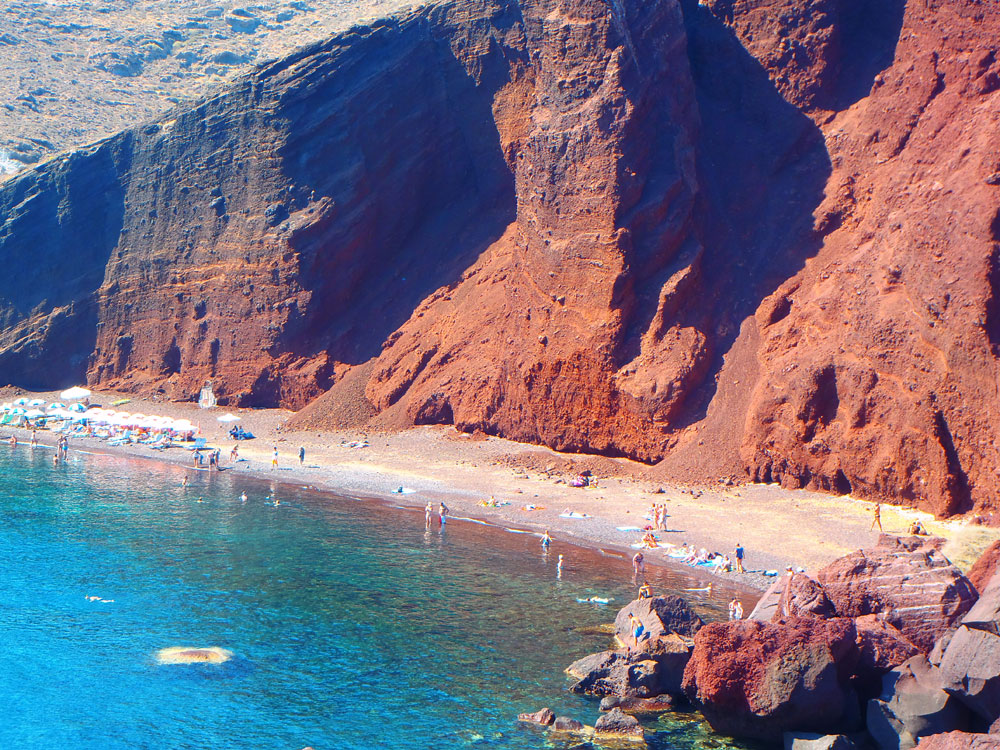 Het rode strand van Santorini: Het Rode Strand is een direct resultaat van de geologische geschiedenis van Santorini. De kliffen bestaan voornamelijk uit: Rode en zwarte lava-rotsen: Gevormd na de massale Minoïsche uitbarsting (die ook Akrotiri begroef).