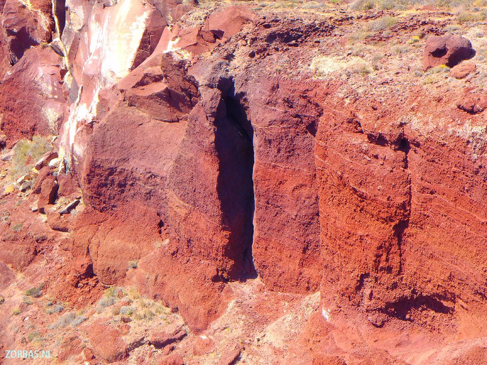 Dit creëert een buitenaards aandoend landschap waarbij het helderblauwe water van de Egeïsche Zee scherp contrasteert met het diepe rood van de kliffen en het zand.