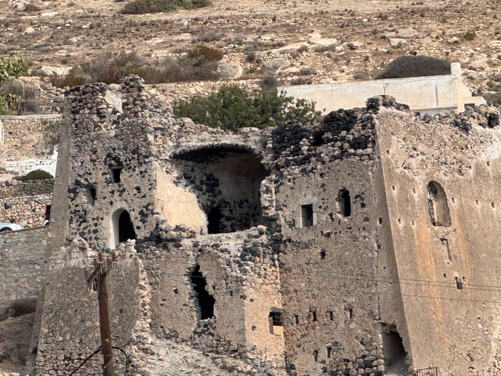 De architectuur van Pyrgos is een reis terug in de tijd. Het dorp is gebouwd rondom het indrukwekkende Venetiaanse kasteel (Kasteli), een middeleeuwse vesting die uitsluitend te voet bereikbaar is. Wandel door de doolhofachtige straatjes die omhoog leiden naar het kasteel. Deze smalle, kronkelende paden waren vroeger bedoeld om piraten in verwarring te brengen.